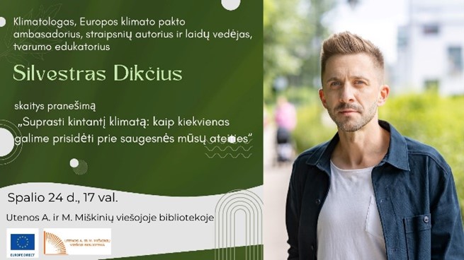 Kviečiame į Europe Direct Utena organizuojamą renginį, skirtą Klimato savaitei. Renginys vyks Utenos A. ir M. Miškinių viešojoje bibliotekoje spalio 24 d. 17 val. Renginio metu klimatologas Silverstras Dikčius skaitys pranešimą ,,Suprasti kintantį klimatą: kaip kiekvienas galime prisidėti prie saugesnės mūsų ateities“. Daugiau informacijos rasite internetiniu adresu https://www.facebook.com/events/510849095094830/?ref=newsfeed