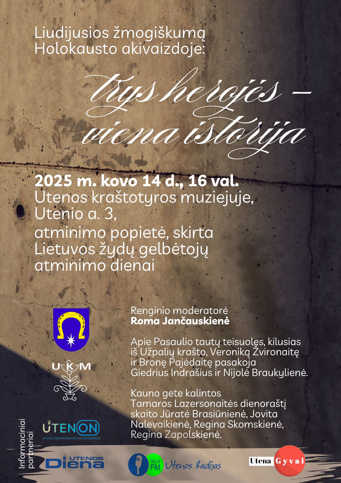 Utenoje žydų gelbėjimo istorijas atrasti ir prakalbinti šios atmintinos dienos metu stengiamės antrus metus. Šiemet, bendradarbiaujant Utenos rajono savivaldybės administracijai ir Utenos kraštotyros muziejui, atmintinos dienos išvakarėse, kovo 14 d., organizuojamas renginys ,,Liudijusios žmogiškumą Holokausto akivaizdoje: trys herojės – viena istorija“.