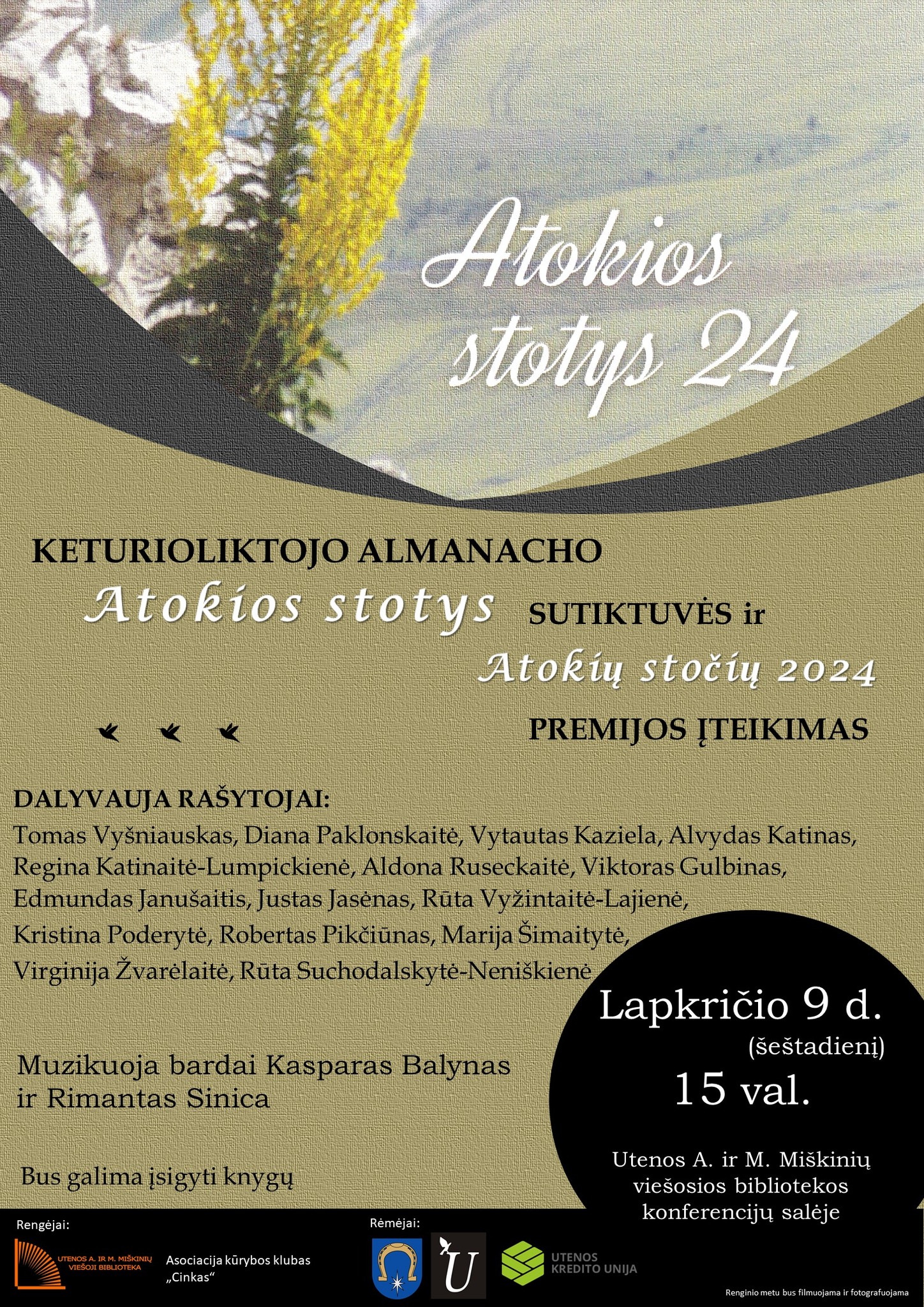 2024 m. spalio 29 d. Utenos rajono savivaldybėje vyko Literatūrinės ,,Atokių stočių“ premijos skyrimo darbo grupės posėdis, kurio metu buvo išrinktas šių metų literatūrinės ,,Atokių stočių“ premijos laureatas – publicistas, eseistas, poetas Česlovas Skaržinskas.