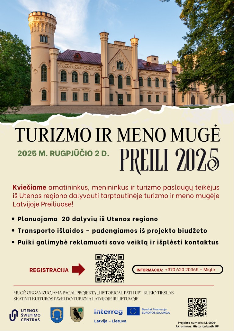 Utenos regiono amatininkai, menininkai, turizmo paslaugų teikėjai – kviečiame prisijungti prie tarptautinės mugės Preiliuose, kuri vyks 2025 m. rugpjūčio 2 d. Preilių rūmų komplekse ir parke, Latvijoje. Tai puiki proga pristatyti savo veiklą platesnei auditorijai, užmegzti kontaktų su Latvijos kūrėjais ir partneriais bei prisidėti prie kultūros paveldo puoselėjimo.
